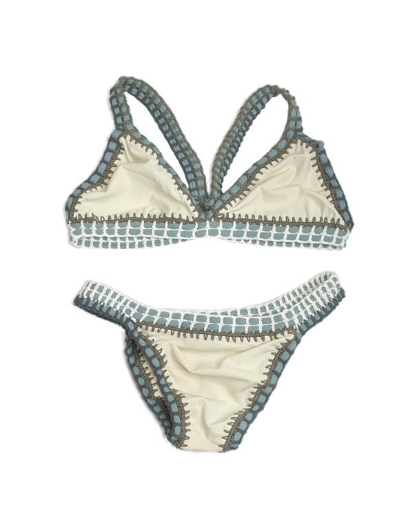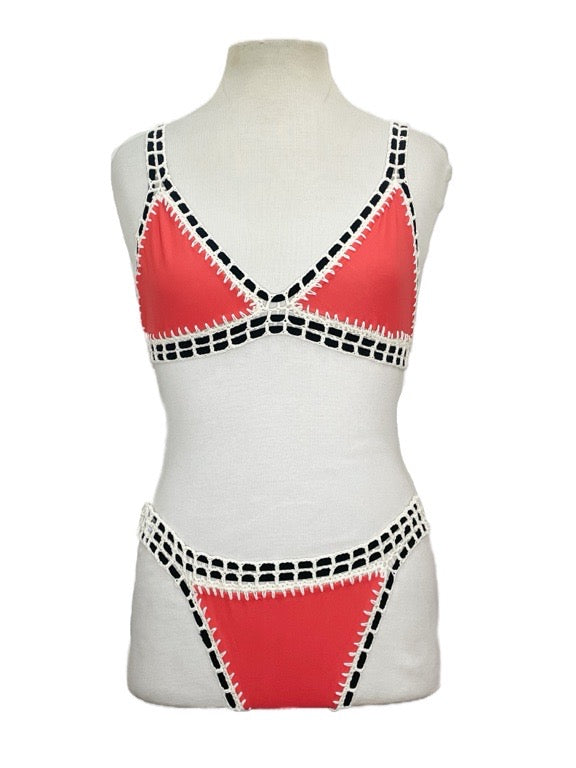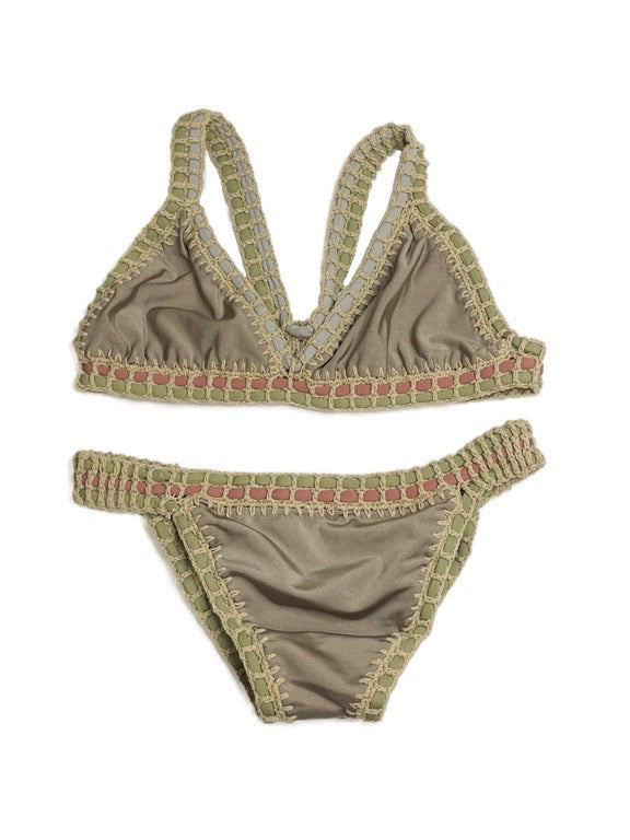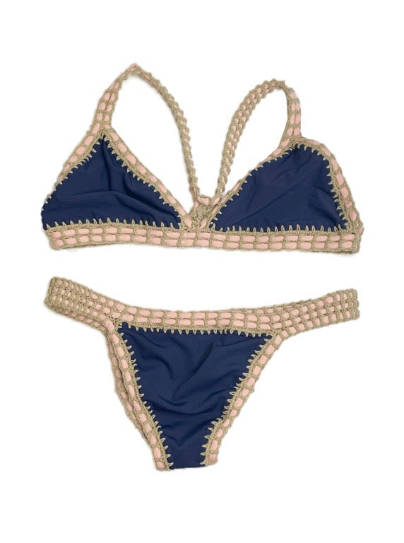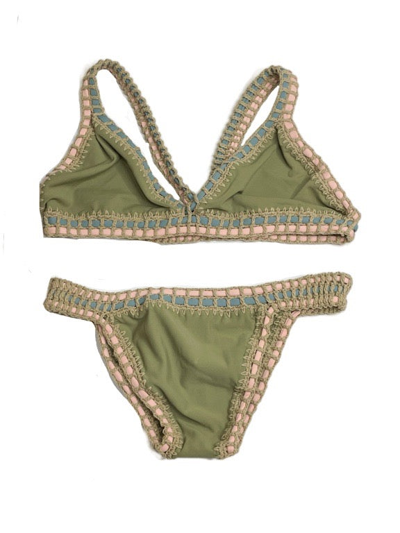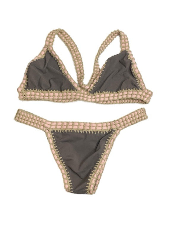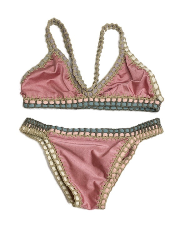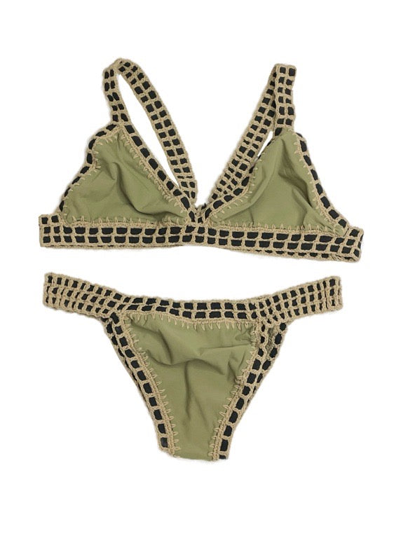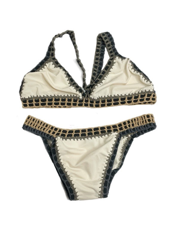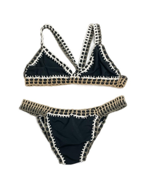 Gorgeous lycra bikini with cotton crochet trim at the edges.