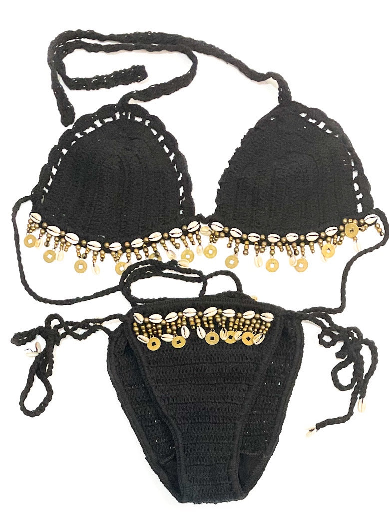 A beautiful crochet bikini with cowry shell, brass bead and coin trim.