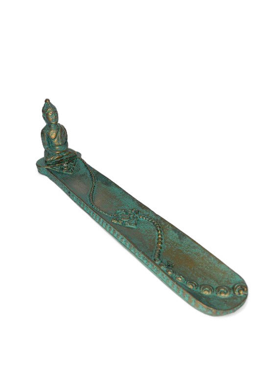 Ceramic cast incense holder with a meditating Buddha figure.