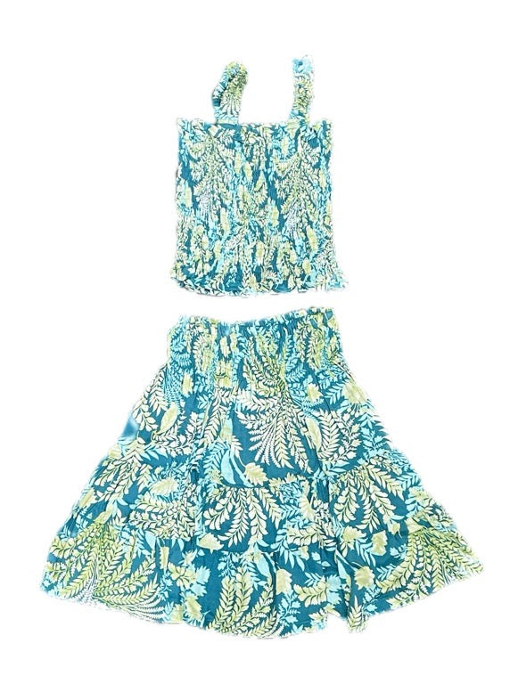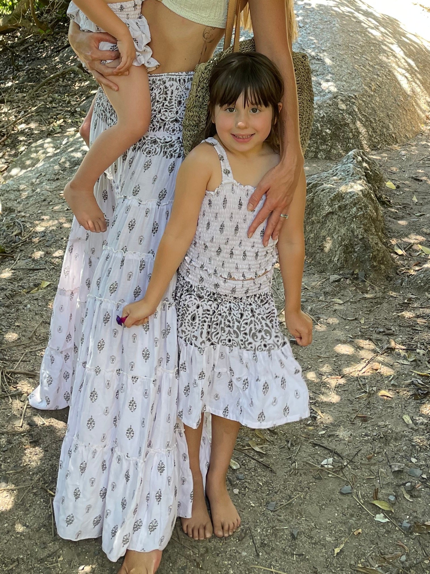 A shirred top with comfy wide straps, paired with a tiered skirt.