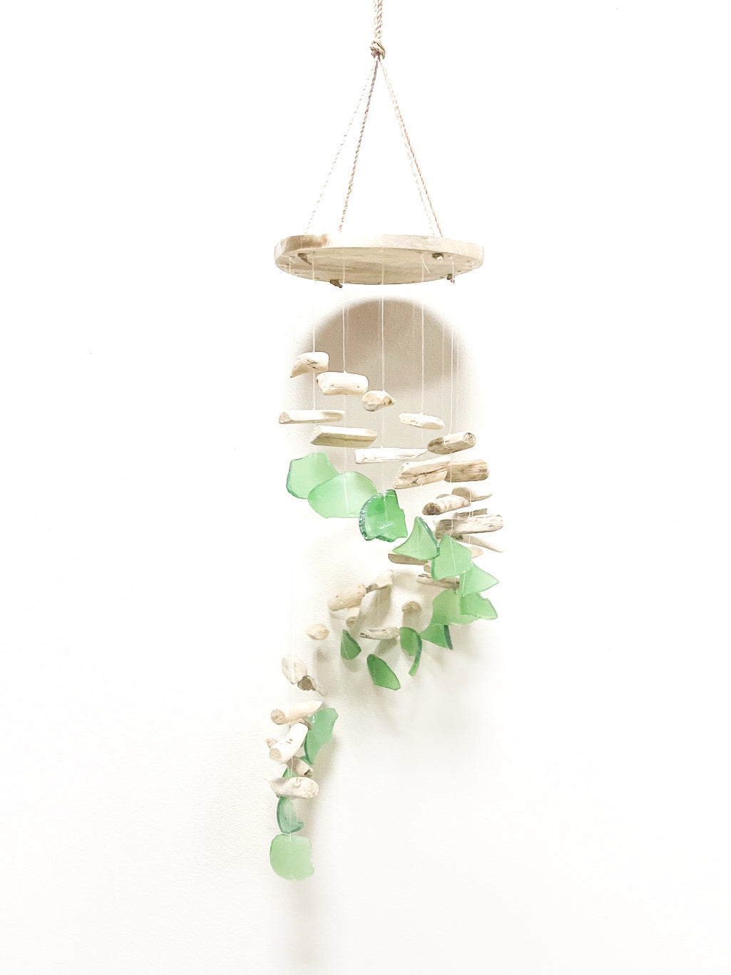 Driftwood disk with driftwood pieces & sea-glass dangling at the bottom.