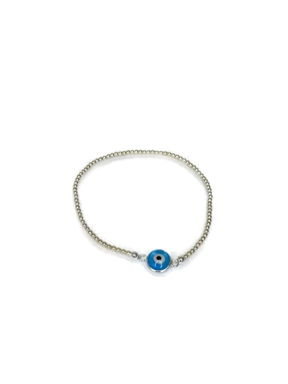 Make a statement with this bold and beautiful silver evil eye bracelet, featuring a striking blue eye charm and a dainty chain that's both delicate and bold.