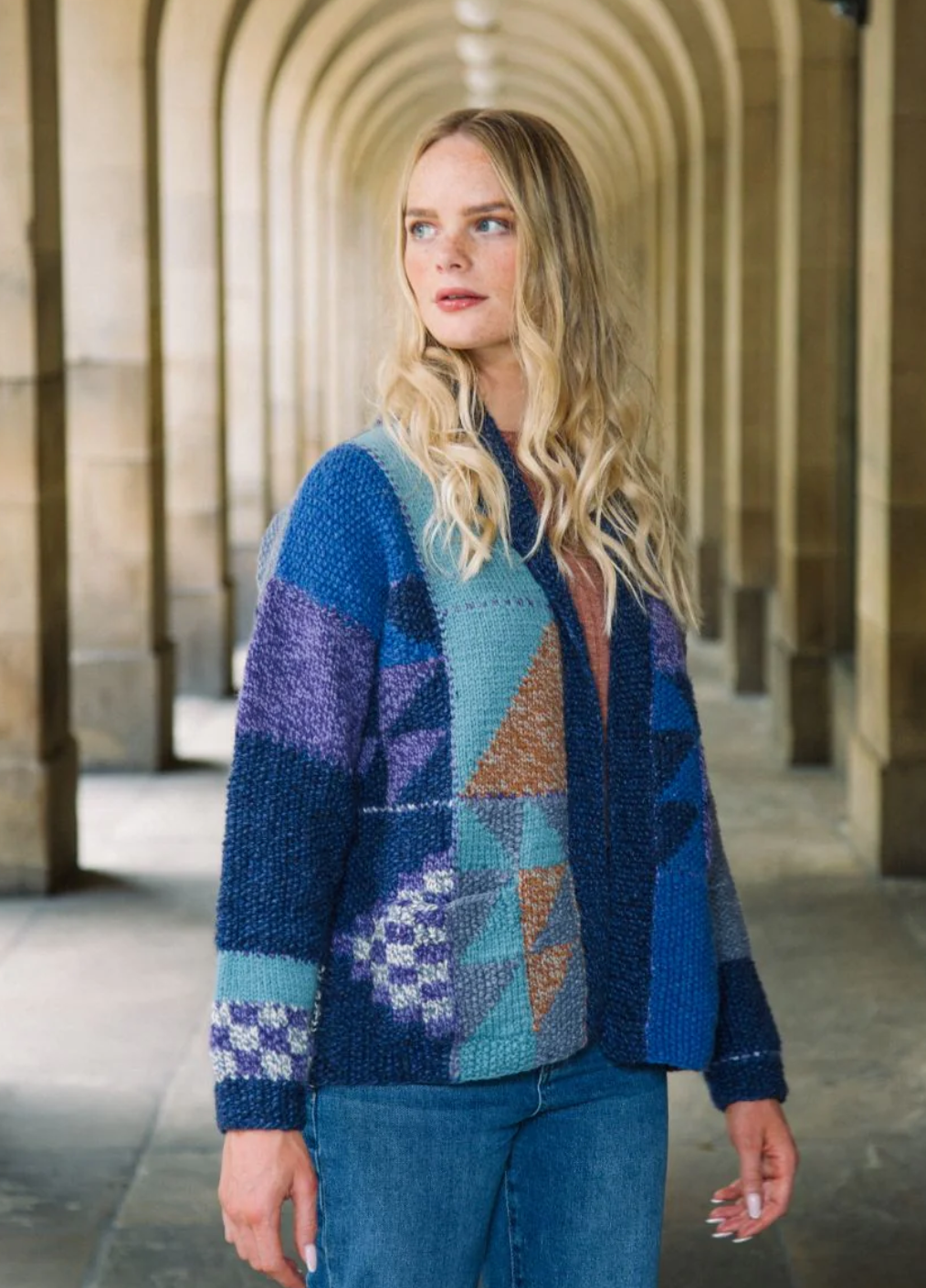 Shawl collar, open front silhouette with patch pockets and moss stitch trims.