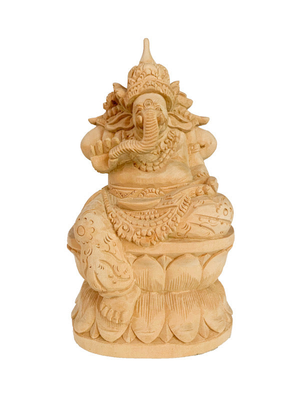 Detailed, hand carved Ganesha sitting on a lotus.