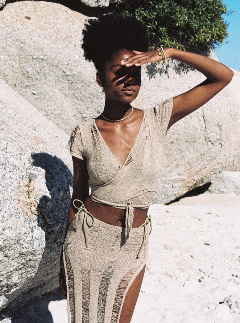 Knitted wrap top and long skirt set.