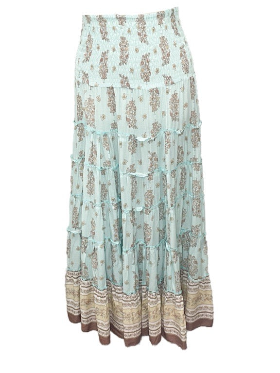 A wide hem, maxi skirt with a shirred waist that can be worn as a skirt or dress.