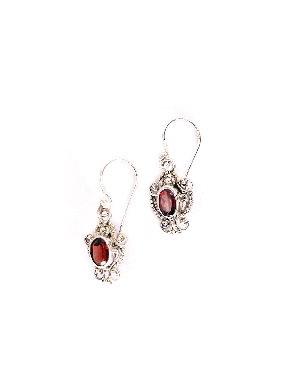 Sterling silver drop earrings with oval garnet stones.