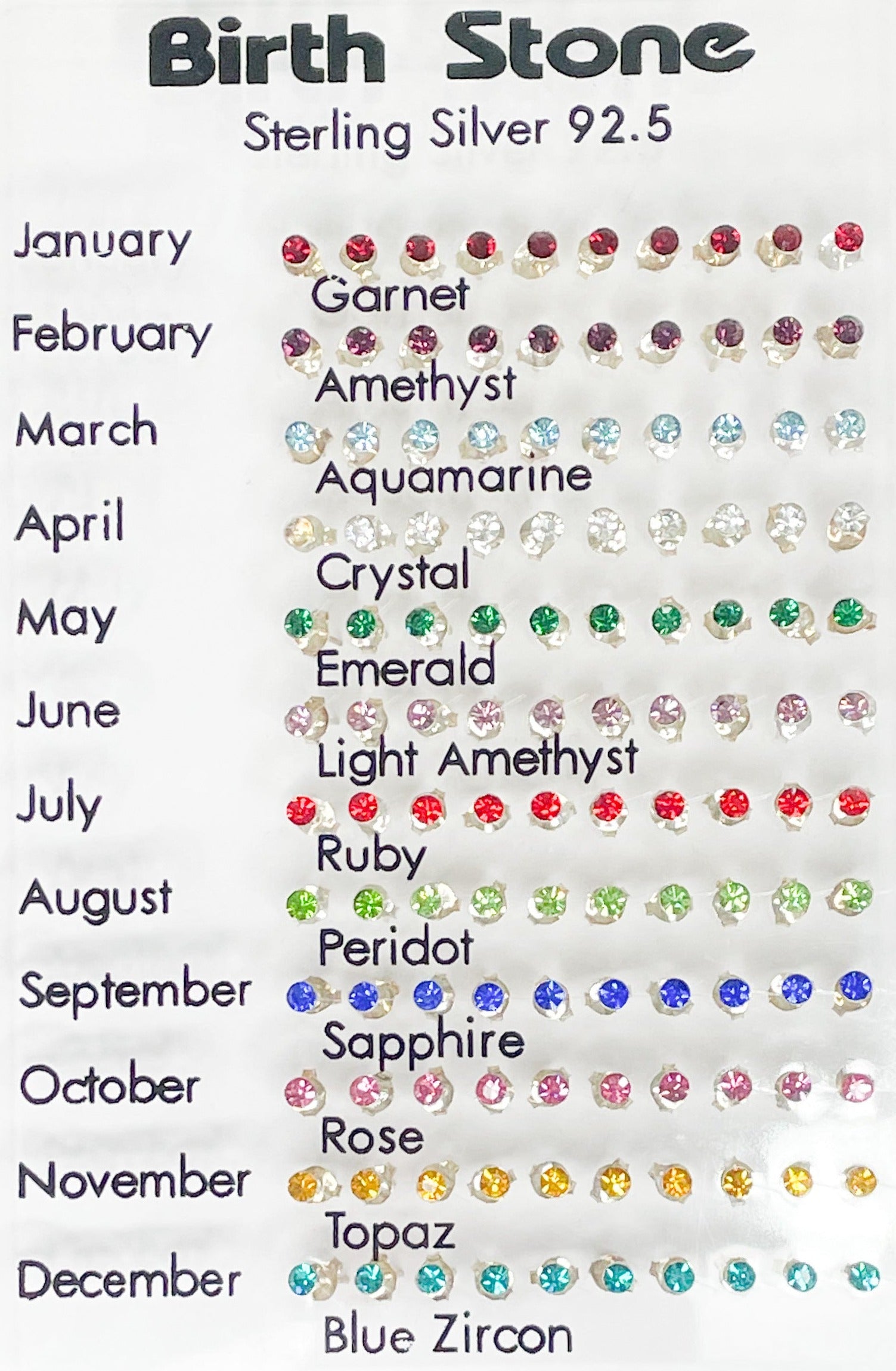 Sterling silver stud earrings. Crystal gem stones for each birth month.
