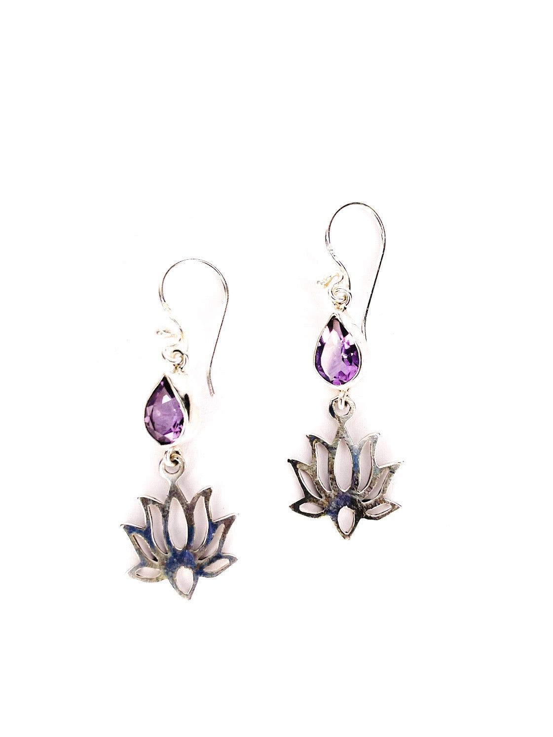 Drop earrings in sterling silver with lotus flower and amethyst stones.