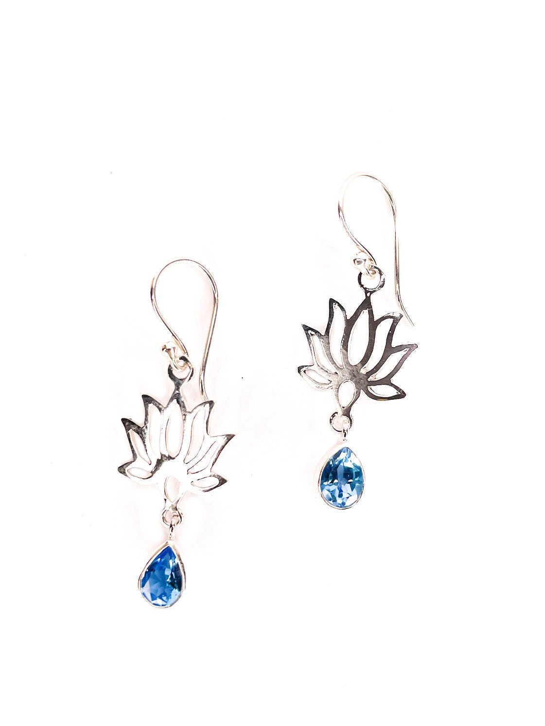 Drop earrings in sterling silver with lotus flower and aquamarine stones.