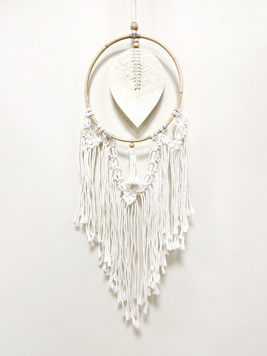 Rattan frame with single macrame leaf.