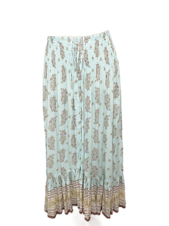 Maxi printed skirt with shirred waist for maximum comfort. Can be worn high-waisted or in the waist. Centre front button and loop detail with front slit to knee.