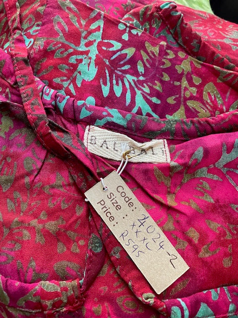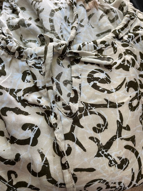 Soft rayon, breathable. Neckline adjustable by drawcord.