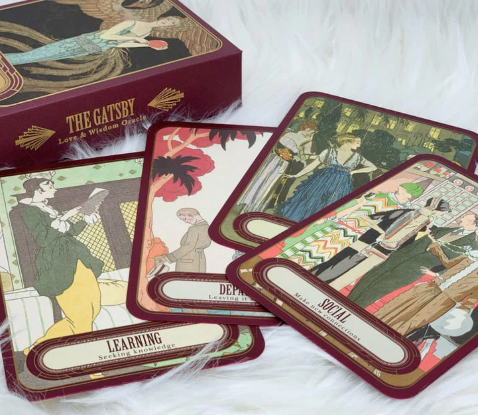 The Gatsby Love & Wisdom Oracle is a beautiful and unique oracle deck that pays tribute to the movie, The Great Gatsby. It's a work of art you'll want to cherish for years. You'll find over 44 stunning, hand-drawn cards with an oracle system that walks readers through the story of the movie and helps them uncover the wisdom of their own life journey in an interactive way.